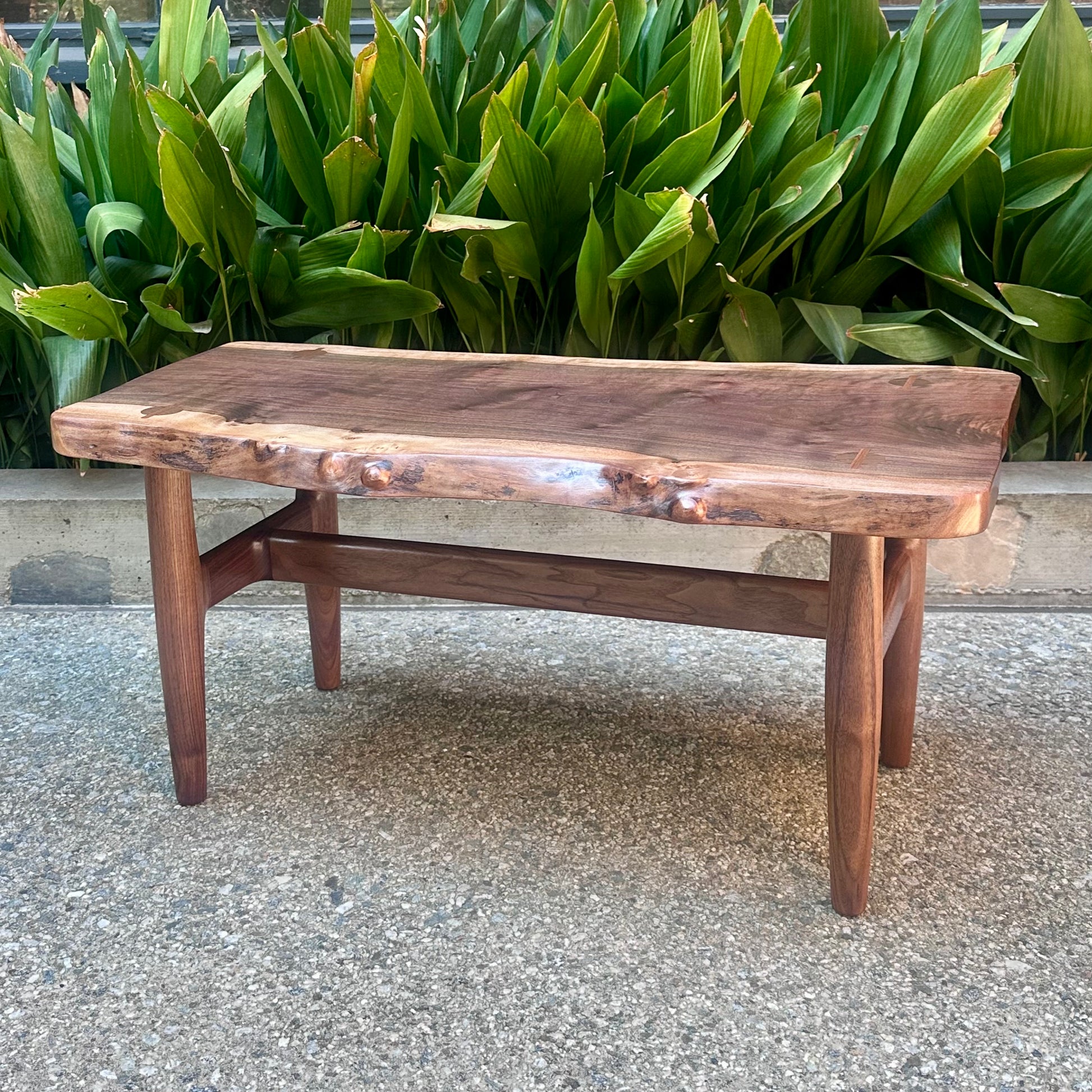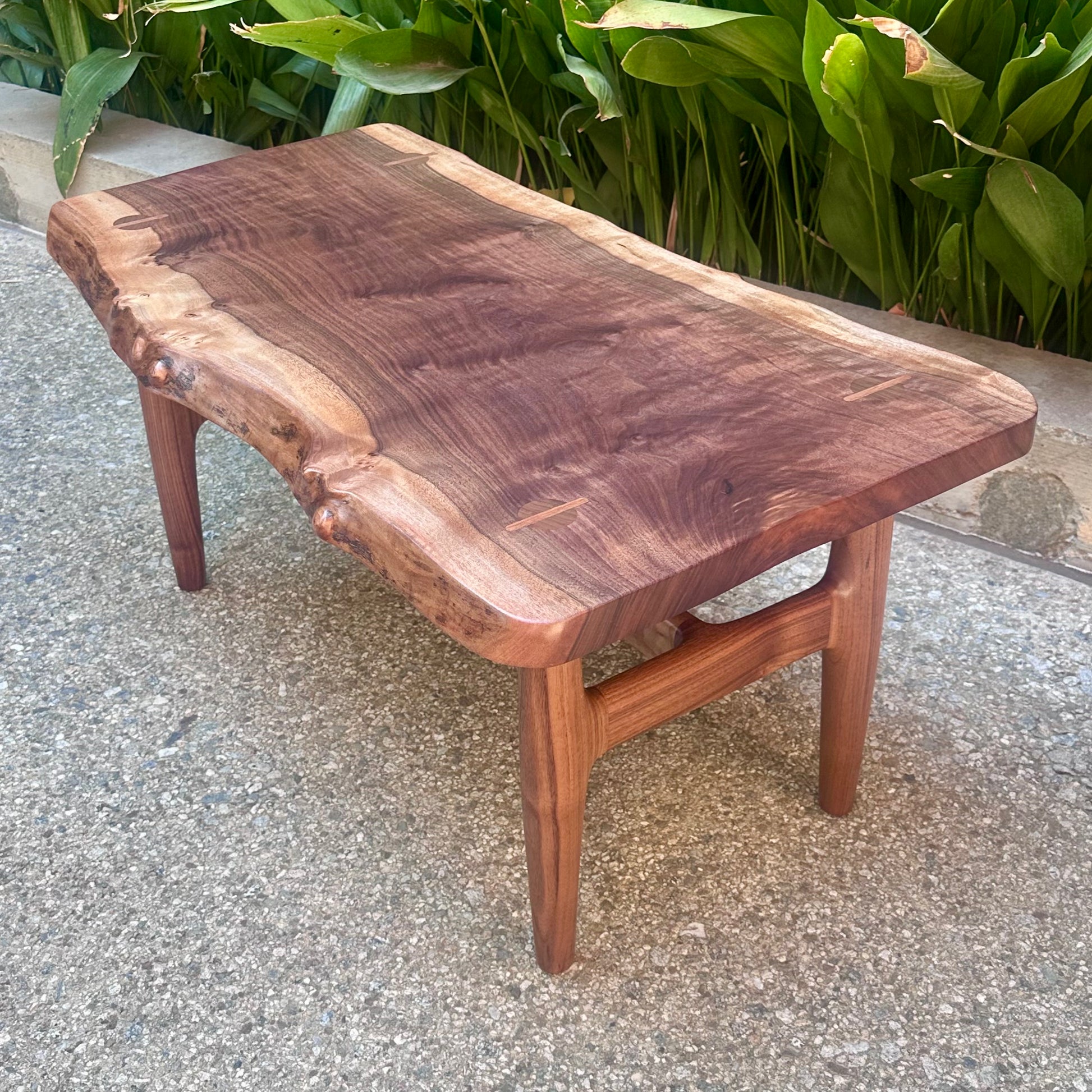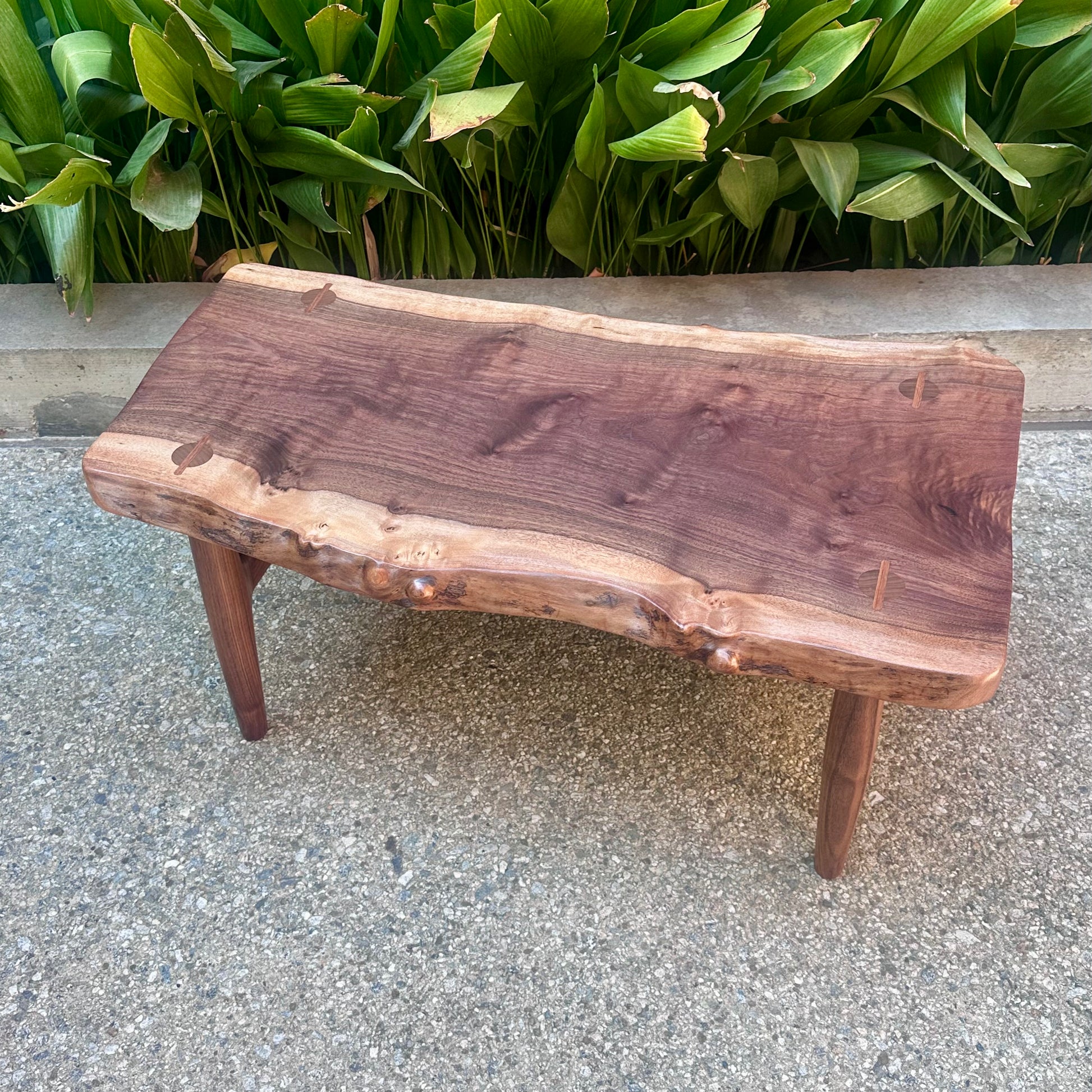 This Claro Walnut coffee table features a single slab top with a base that has turned tapered legs with splined tenons showcased on top.