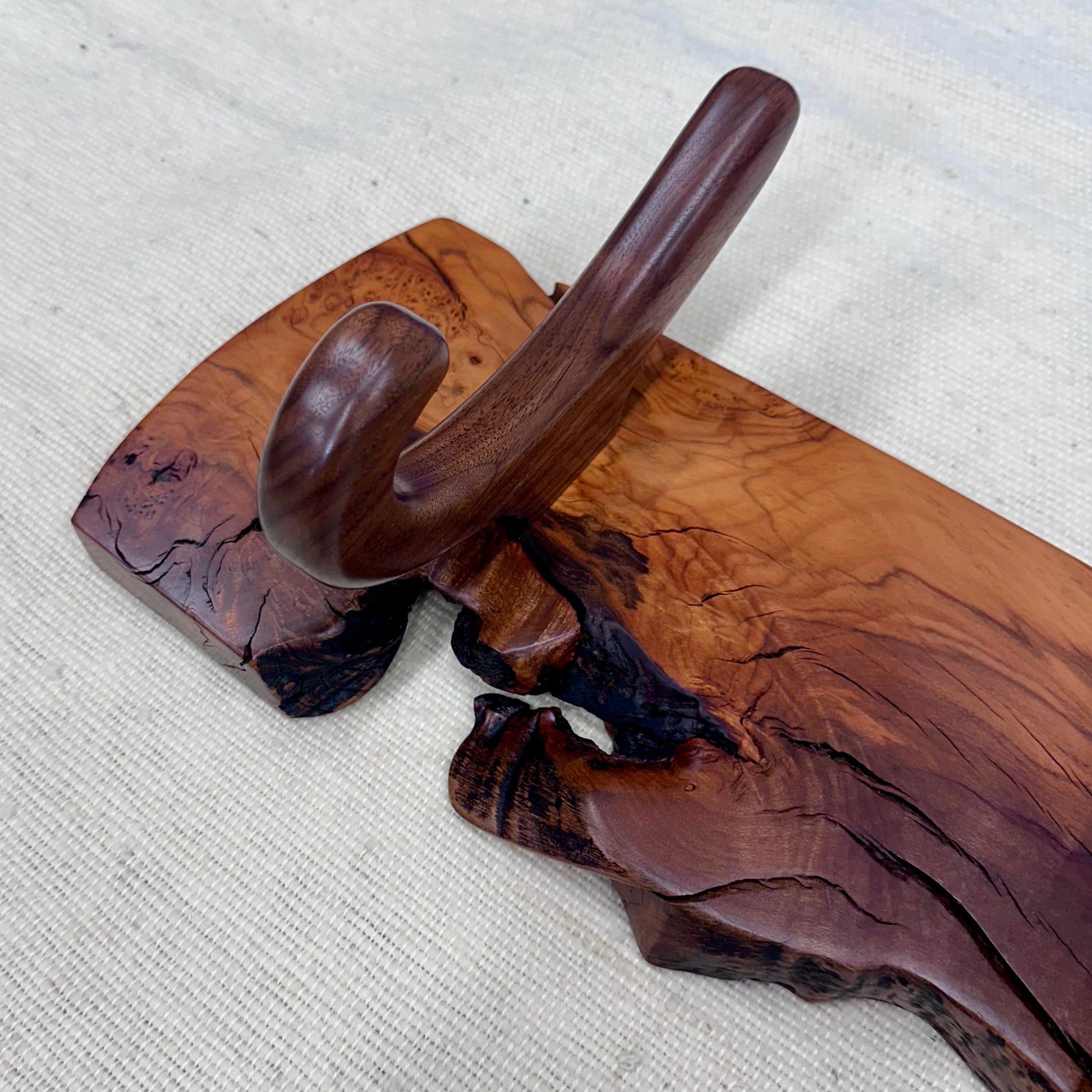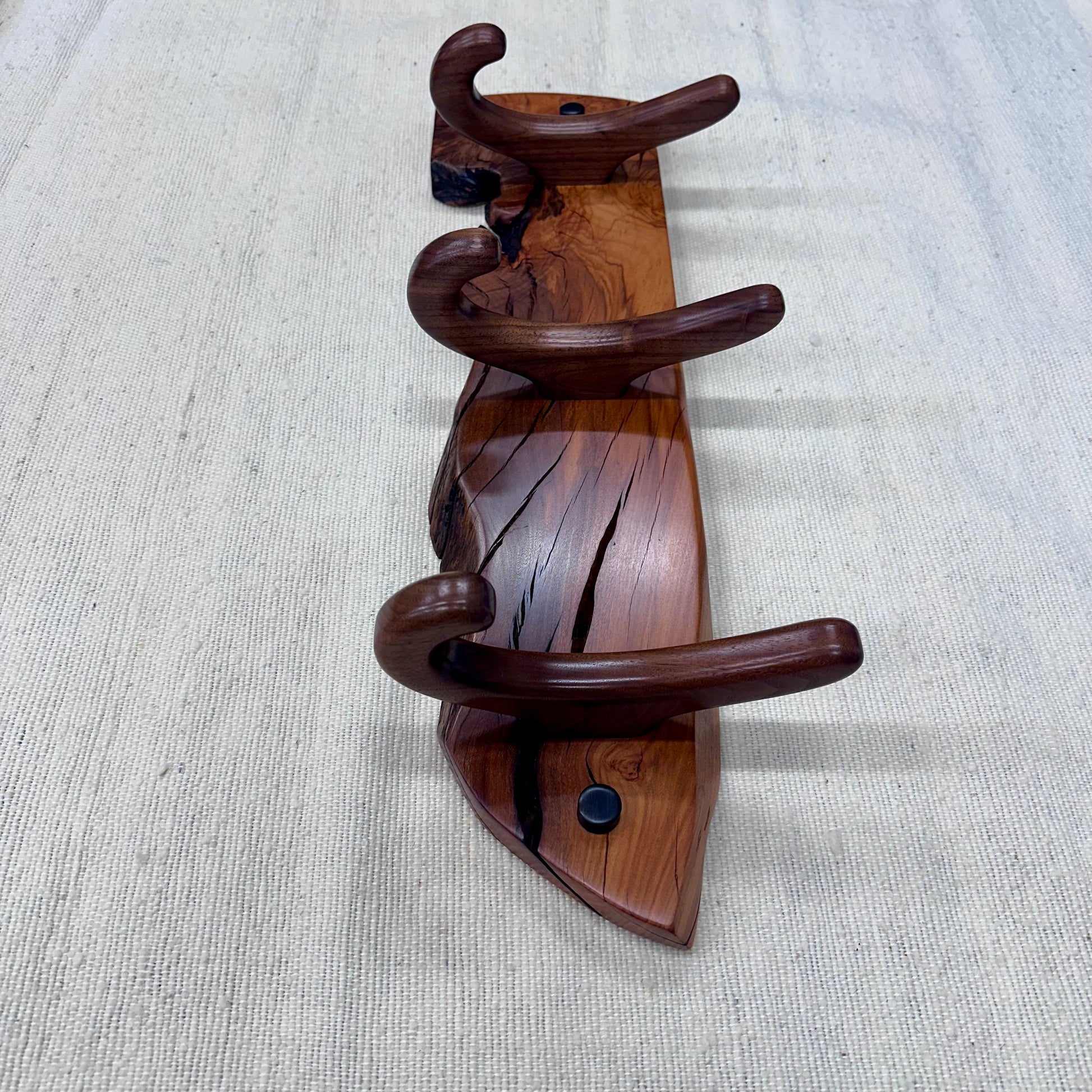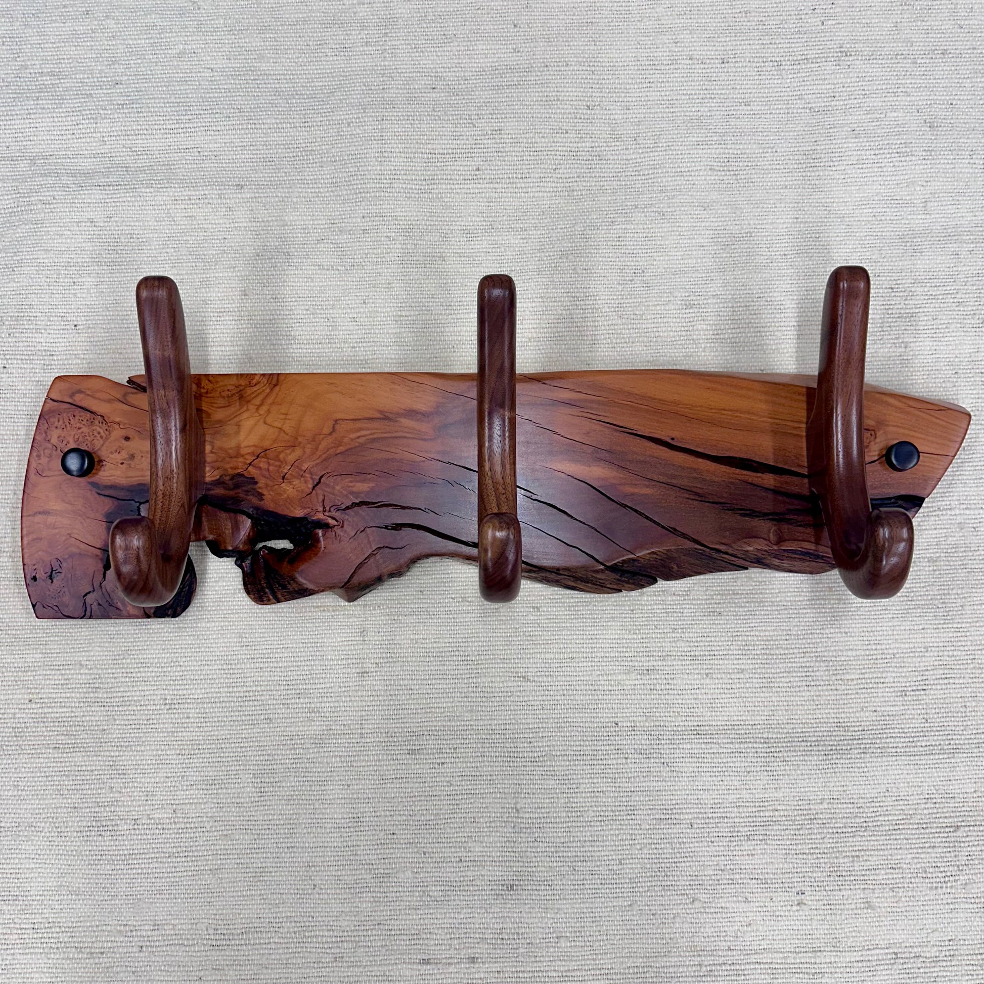 This hanger is made with a beautiful natural edge piece of Pepper Wood and Walnut Hooks.