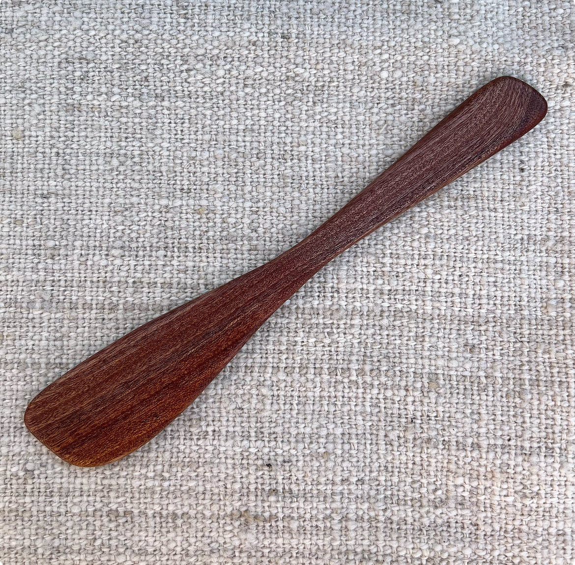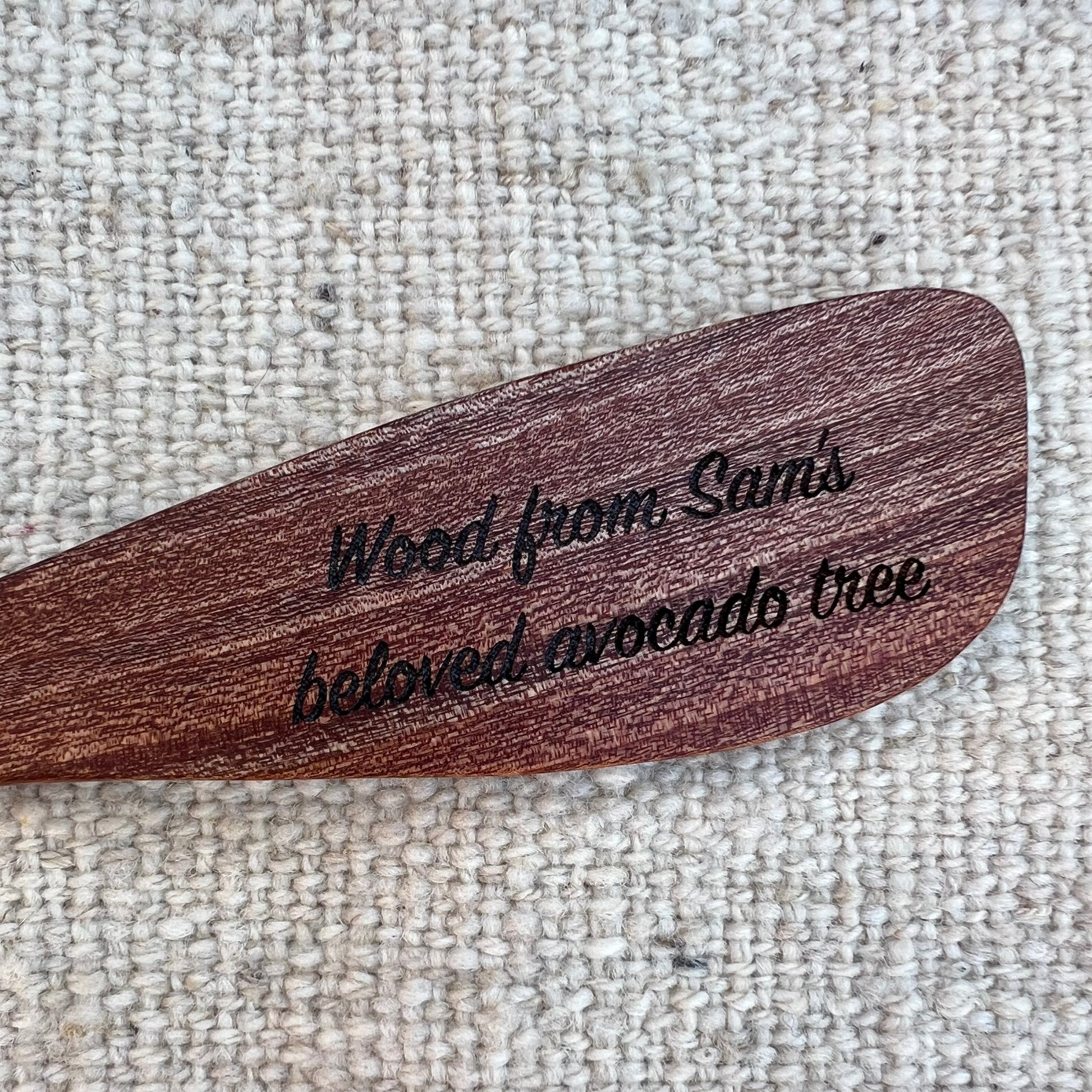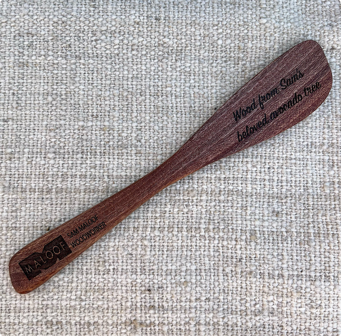 Sam had that tree slabbed up and it has been in our sheds for the past 18 years. From the entire tree we were only able to make 3 pieces of furniture. With the cut offs we will be making a limited amount of accessories, including this stirring spoon!