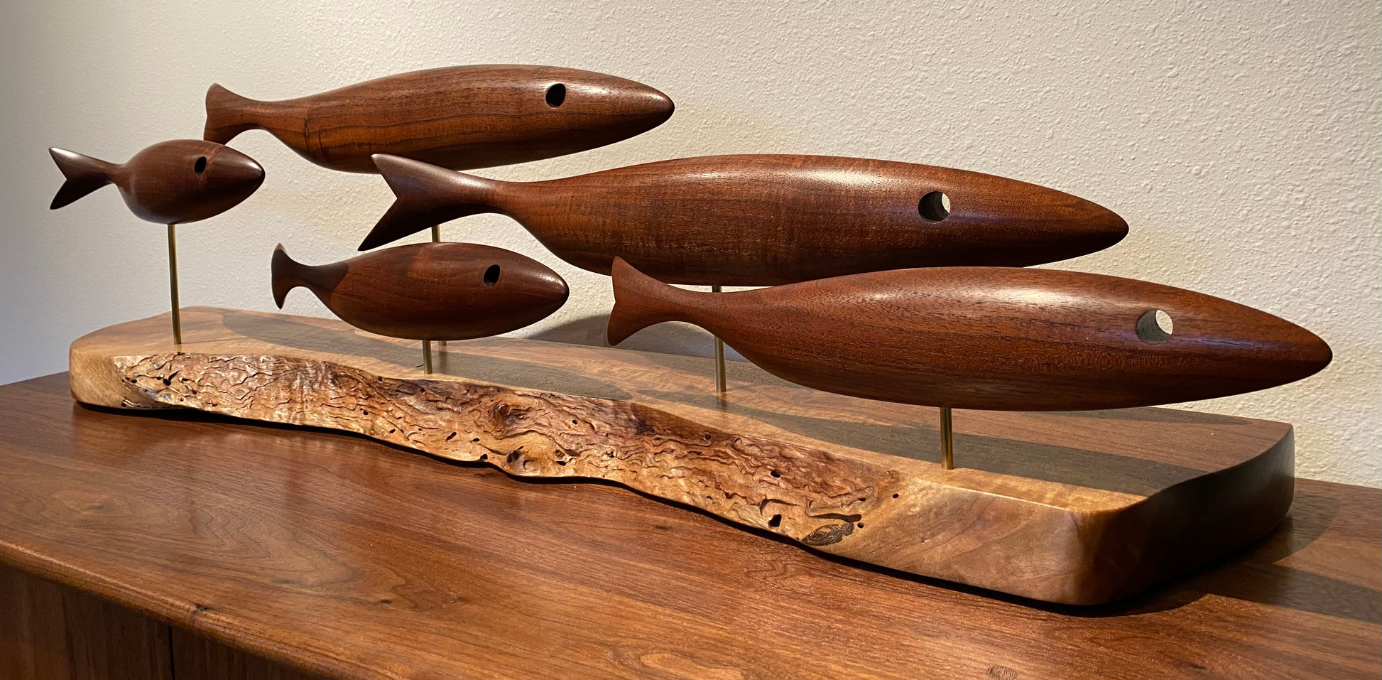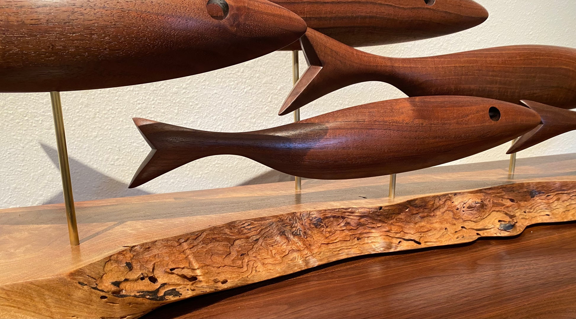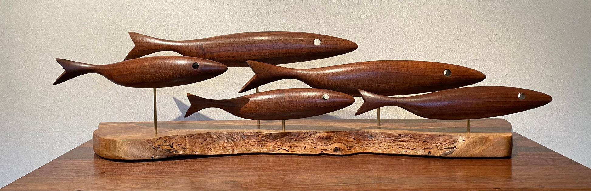 This sculpture is made with a natural edge Claro Walnut base and Claro Walnut Fish